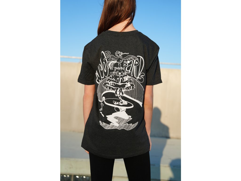 Tmavě šedé tričko Spirit Cat nabízí kultovní design, tentokrát v elegantní monochromatické verzi. Přední část trika je čistá, bez potisku, ale na zádech na zádech kombinuje kresbu kočky, dynamické křivky a ručně stylizovaný nápis Woodboards. Výsledek působí výrazně, ale zároveň čistě a univerzálně.