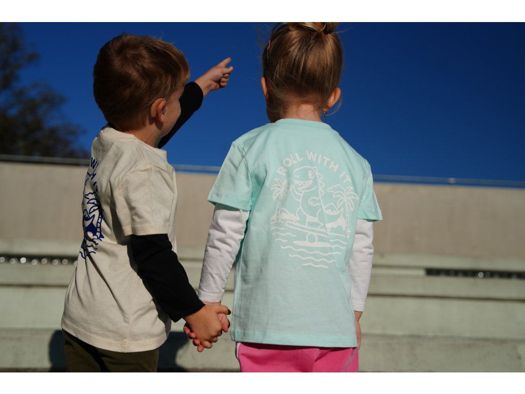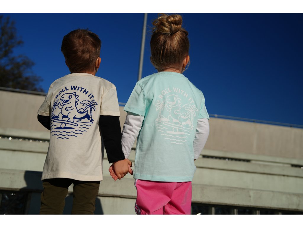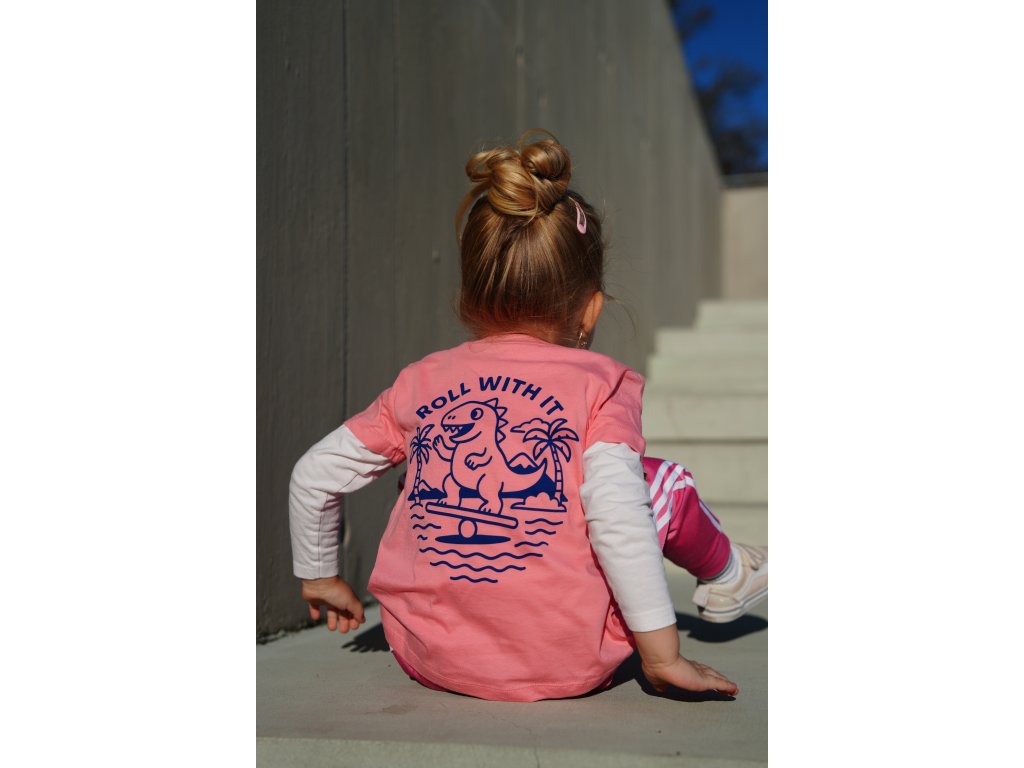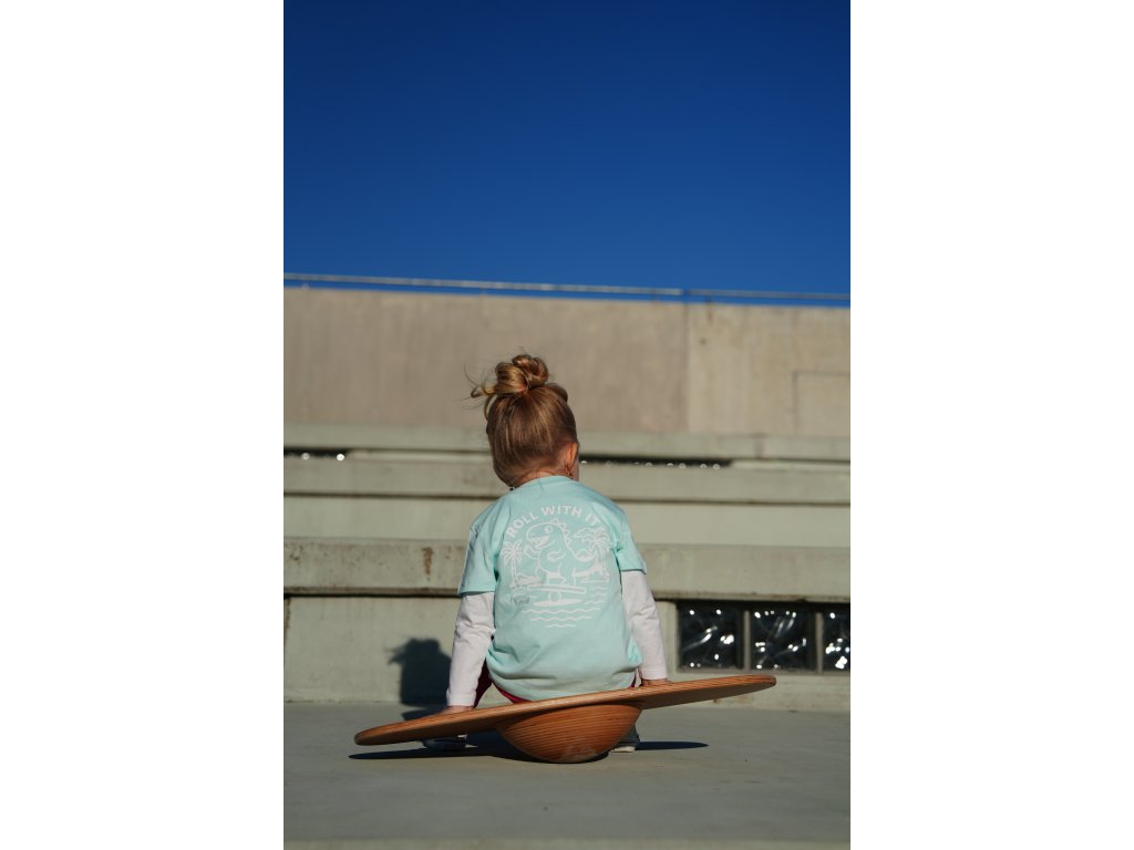 Přední část je jednoduchá a bez potisku, zatímco vzadu najdete hravý motiv dinosaura, který balancuje – ideální připomínka, že pohyb může být dobrodružství.