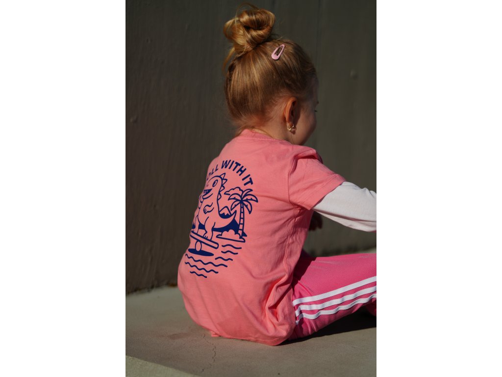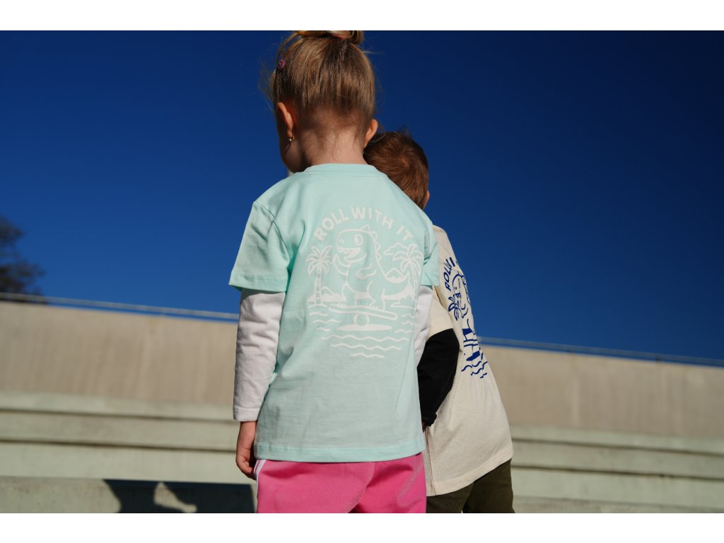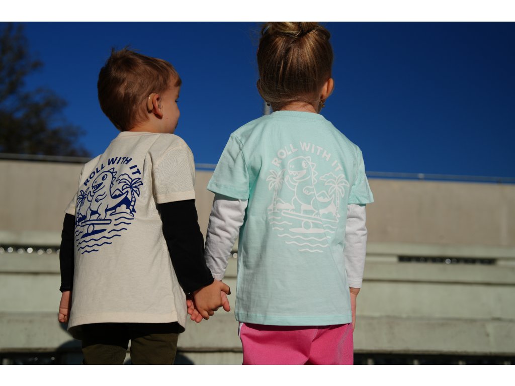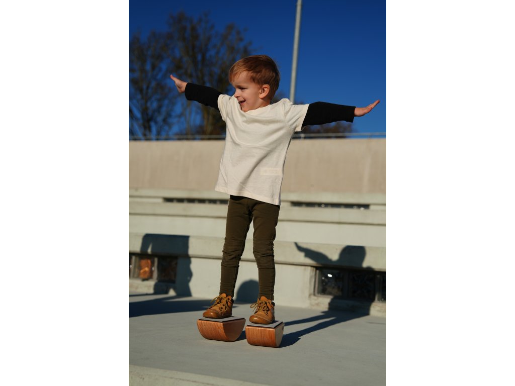 Přední část je jednoduchá a bez potisku, zatímco vzadu najdete hravý motiv dinosaura, který balancuje – ideální připomínka, že balanc je největší zábava!